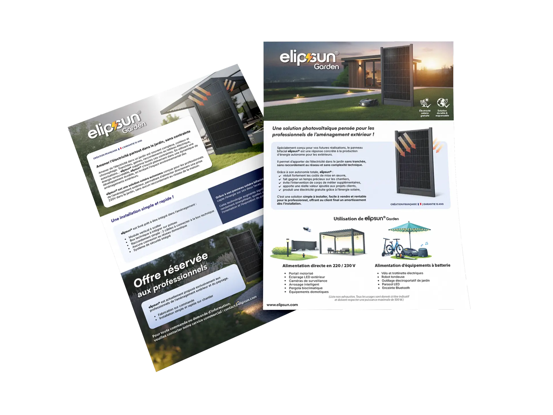 elipsun® est une solution solaire autonome conçue pour les professionnels de lʼaménagement extérieur, permettant d'alimenter directement une prise 220V dans le jardin, sans aucun raccordement au réseau de la maison.